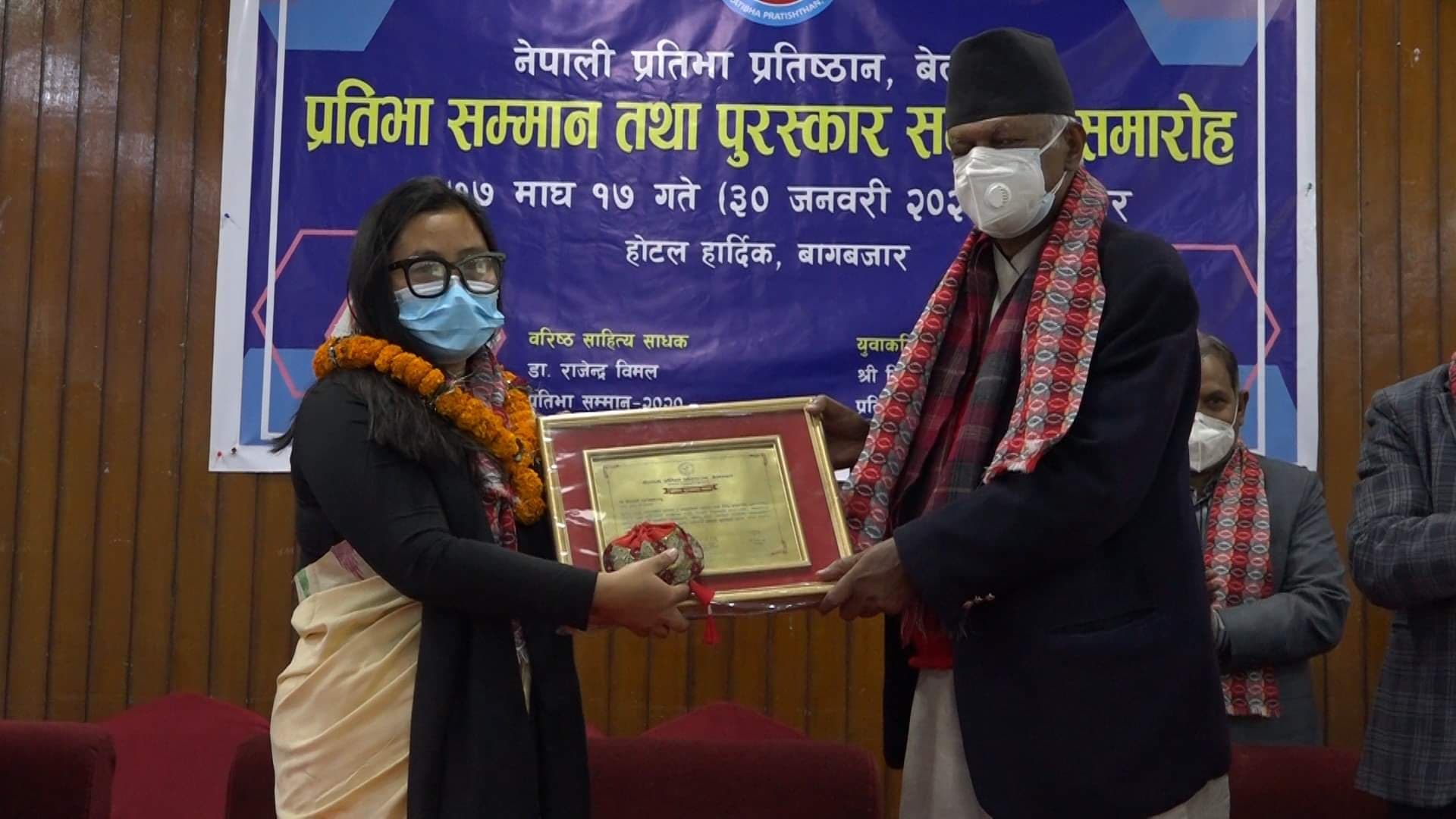 काठमाडौँ, १७ माघ । नेपाली प्रतिभा प्रतिष्ठान, बेलायतले यसवर्षको ‘प्रतिभा सम्मान २०२०’ वरिष्ठ साहित्यकार तथा भाषा संस्कृतिविद् डा राजेन्द्र विमल (जनकपुर) लाई प्रदान गरेको छ । नेपाली भाषा, साहित्यको विकास प्रवद्र्धनमा उल्लेखनीय योगदान पु¥याएबापत विमललाई नगद रु ५० हजार र सम्मान–पत्रसहित सम्मान गरिएको हो । त्यस्तै नगद रु एक लाख राशिको ‘प्रतिभा पुरस्कार–२०२०’ युवाकवि विमला लुम्खेवा (तेह्रथुम) लाई प्रदान गरिएको छ ।