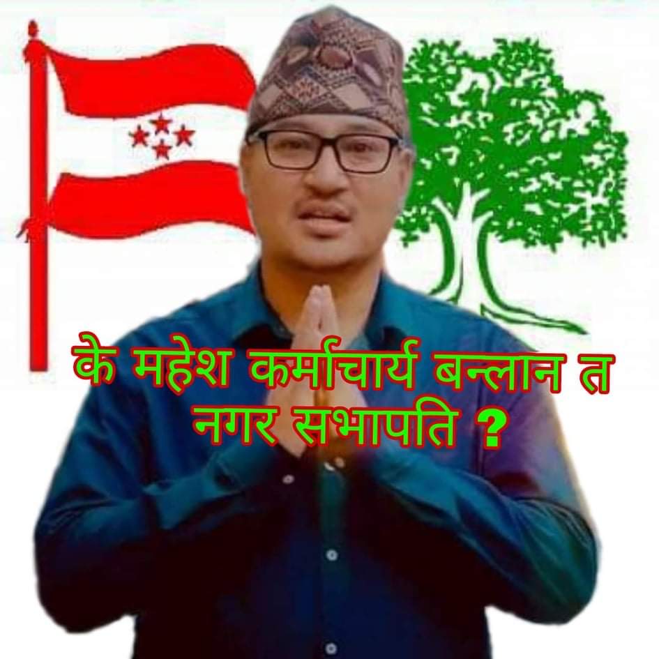 बनेपा बोइज क्लबका अध्यक्ष एवम नेपाली काँग्रेस बनेपा नगर सचिव महेश कर्माचार्य आउदै गरेको नेपाली काँग्रेसको १४ औँ अधिवेशनमा बनेपा नगरको सभापतिका दाबेदार हुन । नेपाली काँग्रेसको १४ औं अधिबेशनमा काँग्रेस बनेपा नगर सभापतिको उम्मदेवारी दिएका कर्मचार्यको सम्भावना कति छ ? के उनी बन्लान् त नगर सभापति ? यहीँ नै अहिले सबैको चासोको विषय बनेको छ । त्यस्तो त महेश कर्माचार्य नेपाली काँग्रेस बनेपा नगर पार्टीको पहिलो तहका नेता भएकाले अहिले उनी निरन्तर नेतृत्व तहमा छन् । त्यसकारण पनि सभापतिमा उनको सम्भावना बढि हुने विश्लेषण गरिएको छ ।