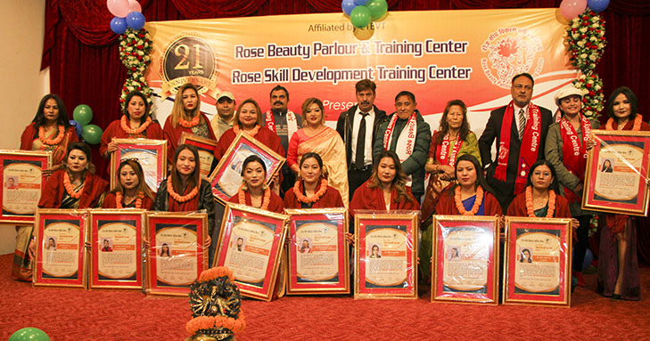 काठमाडौं – काठमाडौंको रविभवन स्थित रोज सिप विकाश तालिम केन्द्र तथा रोज ब्युटी पार्लर एन्ड ट्रेनिङ सेन्टरले विभिन्न व्यक्तित्वहरुलाई सम्मान गर्दै आईतबार काठमाडौंमा आफ्नो २१ औं वार्षिक उत्सव मनाएको छ । बरिष्ट ब्युटिसियन तथा रोज सिप विकाश तालिम केन्द्रकी अध्यक्ष सोनी कारंजितको सभापतित्वमा सम्पन्न सो समारोहमा समाजसेवी, व्यबसायी, सौन्दर्यकर्मी, फेसन डिजाईनजरलगायतलाई सम्मान गरिएको थियो ।