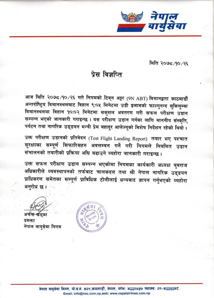 उक्त परीक्षण उड़ानको प्रतिवेदन (Test Flight Landing Report) तयार भए पश्चात सुरक्षाका सम्पूर्ण सिफारिसहरु अवलम्बन गर्न गरी निगमले नियमित उड़ान संचालनको तयारीको प्रक्रिया अधि बढ़ाउने व्यहोरा समेत उल्लेख गरेको छ। उक्त सफल परीक्षण उडान सम्पन्न भएकोमा निगमका कार्यकारी अध्यक्ष युवराज अधिकारीले व्यवस्थापनको तर्फवाट चालकदल तथा श्री नेपाल नागरिक उड्डयन प्राधिकरण समेतका सम्पूर्ण प्राविधिक टोलीलाई धन्यवाद ज्ञापन गरेका छन् ।