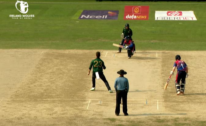 यसअघि कीर्तिपुरको त्रिवि क्रिकेट मैदानमा टस हारेर ब्याटिङ गरेको आयरल्यान्ड–उल्भ्सले २० ओभरमा ५ विकेट गुमाएर २ सय २२ रन बनायो । आयरल्यान्ड–उल्भ्सका पिटर मूरले ४९, केड कारमाइकल र कप्तान निल रकले समान ३८, स्टेफेन डोहेनेले ३४, ग्यारेथ डिलेनेले नट आउट ३० रन बनाए । बलिङतर्फ नेपाल ‘ए’ का कमलसिंह ऐरीले ३ तथा सागर ढकाल र आरिफ शेखले समान १ विकेट लिए ।