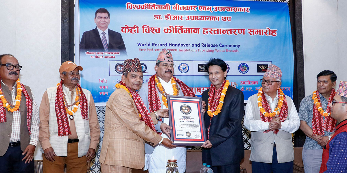 काठमाडौँ- विविध विधामा डेढ सय बढी रेकर्ड बनाएका डा.डीआर उपाध्यायलाई कीर्तिमान हस्तान्तरण गरिएको छ।