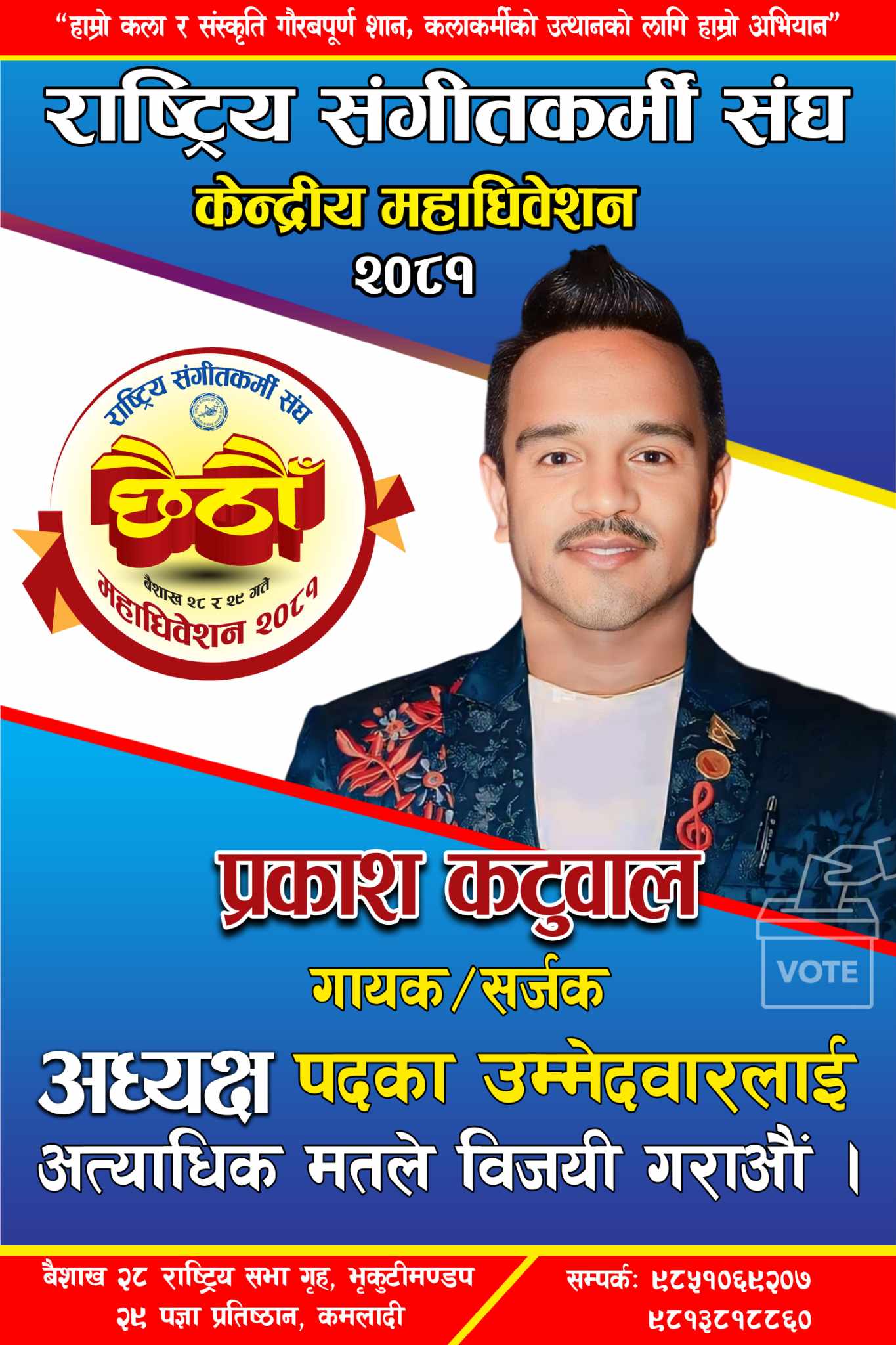 राष्ट्रिय संगीतकर्मी संघका कार्यवाहक अध्यक्ष प्रकाश कटवालले संघको अध्यक्षमा उम्मेदवारी घोषणा गरेका छन् । मुलुकका २० हजार भन्दा बढी कलाकारहरु समेटिएको यस संघको १८ औं वार्षिक साधारणसभा तथा छैटौं केन्द्रिय महाधिवेशन यही २८ र २९ बैशाख काठमाडौंमा आयोजना हुँदैछ । कलाकारहरु यतिबेला अधिवेशनको चापमा छन् ।
