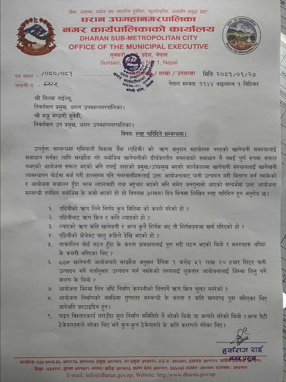 धरान । धरान उपमहानगरपालिकाका मेयर हर्क साम्पाङले पुर्व मेयर र उपमेयरलाई सात दिने स्पष्टीकरण सोधका छन् ।