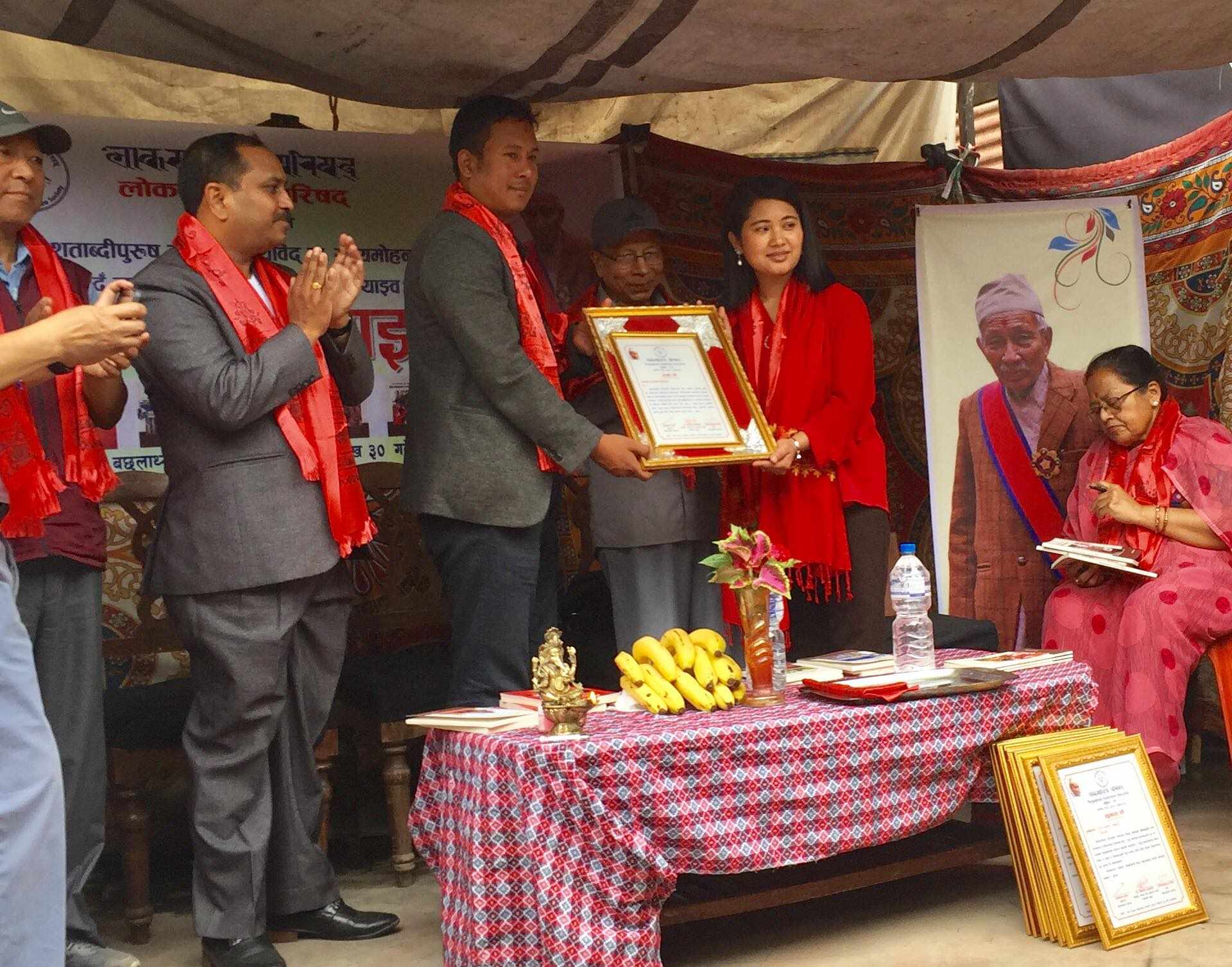 काठमाडौ । शताव्दी पुरुष स्वर्गीय सत्यमोहन जोशीको तस्वीरलाई सगरमाथाको चुचुरोमा पुयाएबापत सगरमाथा आरोही कल्पना महर्जन सम्मानित भएकी छन् । बाङमय शताव्दी पुरुष, लोकसाहित्यकार डा सत्यमोहन जोशीको एक सय पाँंचौं वर्षको जन्मजययन्तीको सप्ताहव्यापी समापन कार्यक्रममा राजधानीमा आयोजित कार्यक्रममा महर्जनलाई सम्मान गरिएको हो । लोकसाहित्य परिषद् बखुबहाल ललितपुरद्धारा आयोजित कार्यक्रममा वागमति प्रदेशका संस्कृति, पर्यटन तथा सहकारी मन्त्री शैलेन्द्र बज्राचार्यले महर्जनलाई सम्मान गरेका हुन् । कार्यक्रमको क्रममा विभिन्न लेखकहरुद्धारा लिखित ६ वटा पुस्तकहरुको पनि विमोचन गरिएको थियो । सगरमाथा आरोही महर्जनले पछिल्लो पटकको सगरमाथा आरोहणमा स्वर्गीय सत्यमोहन जोशीको तस्वीर लिएर सगरमाथाको चुचोरोमा पुरयाएका थिए । आरोही महर्जन पत्रकार एवं अभियन्ता पनि हुन् ।
