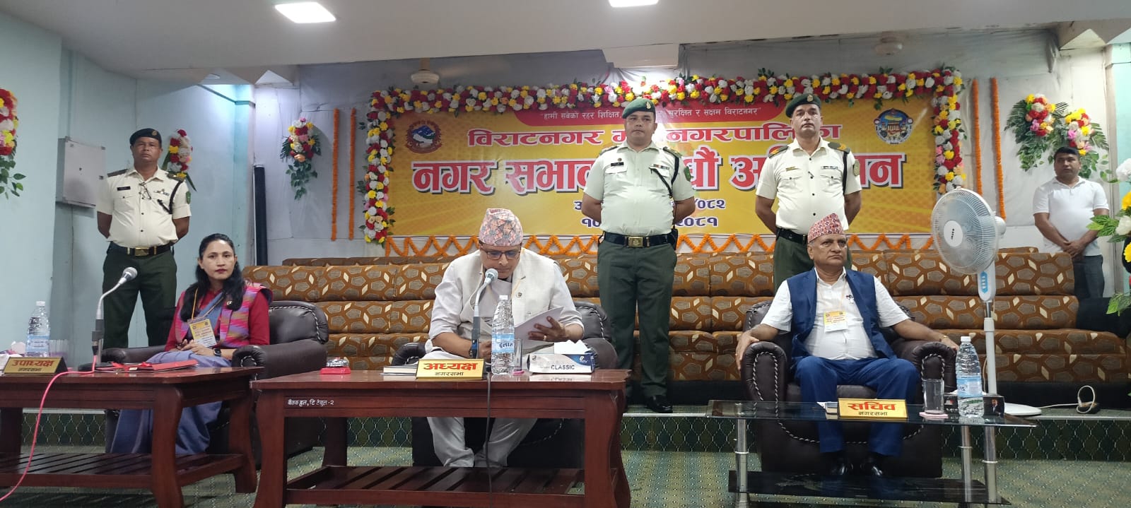 नगरसभालाई सम्बोधन गर्दै मेयर नागेश कोइरालाले सबैको सामूहिक प्रयासले मात्रै विराटनगरको विकास गर्न सकिने बताउनुभयो । उहाँले बितेको दुई वर्षमा भौतिकसँगै शिक्षा, स्वास्थ्य र सामाजिक क्षेत्रमा महत्वपूर्ण कार्य गरेको दाबी गर्नुभयो । उहाँले अहिले पनि १ अर्ब १५ करोडभन्दा बढीका ठूला साना परियोजना सञ्चालनमा रहेको जानकारी दिनुभयो । ‘बहुवर्षीय योजनाअन्तर्गत विराट राजाको दरबार, रानीपोखरी, मण्ठापोखरी, पूर्वप्रधानमन्त्री पार्क, सन्ध्याकालीन आरती स्थल, बाल उद्यन, महानगरको बहुप्राविधिक शिक्षालयको भवन, महानगरको प्रशासनिक भवनसहितका ठूला परियोजनाहरू धमाधम निर्माण भइरहेको यहाँहरूलाई जानकारी गराउन चाहन्छु । करिब २२ करोडको लागतमा जीर्णोद्वार गरिएको वीरेन्द्रसभा गृह हस्तान्तरणको चरणमा पुगेको छ । अहिले पनि करिब १ अर्ब १५ करोडभन्दा बढीका साना ठूला परियोजना सञ्चालनमा रहेका छन्, मेयर कोइरालाले भन्नुभयो, ‘बितेको दुई वर्षमा २० किलोमिटर कालोपत्रे भएको छ भने ४२ किलोमिटर नयाँ सडकमा ग्राभेल गरिएको छ । विभिन्न वडामा १ सय ५२ वटा कल्भर्ट निर्माण सम्पन्न गर्न सफल भएका छौं ।’ विराटनगरमा भएका बैंक तथा वित्तीय संस्थाहरूको आर्थिक सहयोगमा बरगाछी–रानी सडकको सौन्दर्यकरण परियोजना सुरु भइसकेको जानकारी दिँदै मेयर कोइरालाले विराटनगरको विकासमा व्यावसायिक संघसंस्था, उद्योगी, व्यवसायीसहितका निजी क्षेत्रलाई सहयोगका लागि अपिलसमेत गर्नुभयो । ढाटदेखि रानीसम्मको सडकमा अन्तर्राष्ट्रिय मापदण्डकको बत्ती जडान गर्ने योजना अघि सार्नुभएका मेयर कोइरालाले मुख्य चोकहरूमा विद्युतीय बत्तीसहितको सौन्दर्यकरण गर्ने तयारीमा रहेको जानकारी दिनुभयो । पानीटंकीदेखि पुष्पलाल चोकसम्म रहेको सोलारको पोलमा विद्युतीय बत्ती जडान गर्ने कार्य केही छिट्टै सुरु हुने उहाँको भनाइ थियो । करिब ६ करोड लागतमा वडा नम्बर ११ देखि १६ नम्बर वडासम्मको नहरमा कालोपत्रेका लागि ठेक्का सम्झौता भइसकेको उहाँले बताउनुभयो । मेयर कोइरालाले रानी प्राथमिक स्वास्थ्य केन्द्र र उत्तरी क्षेत्रमा रहेको बैजनाथपुर हेल्थ पोष्टलाई अस्पतालमा स्तरोन्नति गरेको उल्लेख गर्नुभयो । ‘रानी अस्पतालमा फिजियो थेरापी, भिडियो एक्स–रेलगायतका सुविधा थप गरिएको सम्मानित सभालाई जानकारी गराउँदछु । यसबाहेक दुवै अस्पतालमा बर्थिङ सेन्टर सञ्चालन गर्ने तयारीसमेत अन्तिम चरणमा पुगेको छ,’ उहाँले थप्नुभयो, ‘रानी अस्पतालमा वर्षौंदेखि थन्किएको एक्स–रे मेसिन र स्वास्थ्य बिमा फार्मेसी सेवा पनि सञ्चालन गर्ने तयारी गरेका छौं । बैजनाथपुर अस्पतालमा स्वास्थ्य बिमा कार्यक्रम लागू गर्ने प्रक्रियामा रहेको छ ।’ भौतिक विकाससँगै नागरिकको स्वा