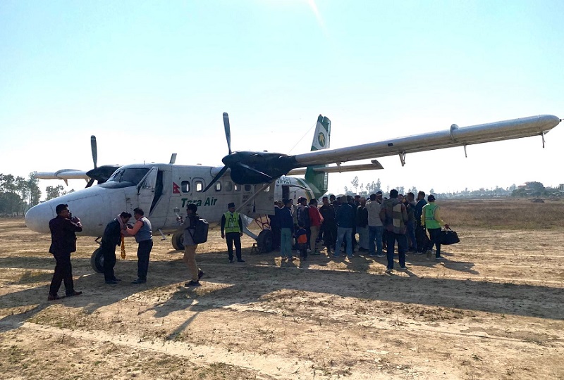 कैलाली – २७ वर्षदेखि बन्द अवस्थामा रहेको कैलालीको टीकापुर विमानस्थलमा आजदेखि उडान शुरु भएको छ । आज दिउँसो तारा एयरको वाइटी १७०१ नम्बरको ट्वीनअटर विमानमा चालक दलका तीनसहित छ कर्मचारी र १२ यात्रु टीकापुर विमानस्थलमा अवतरण गरेसँगै विमानस्थलमा उडान शुरु भएको हो ।