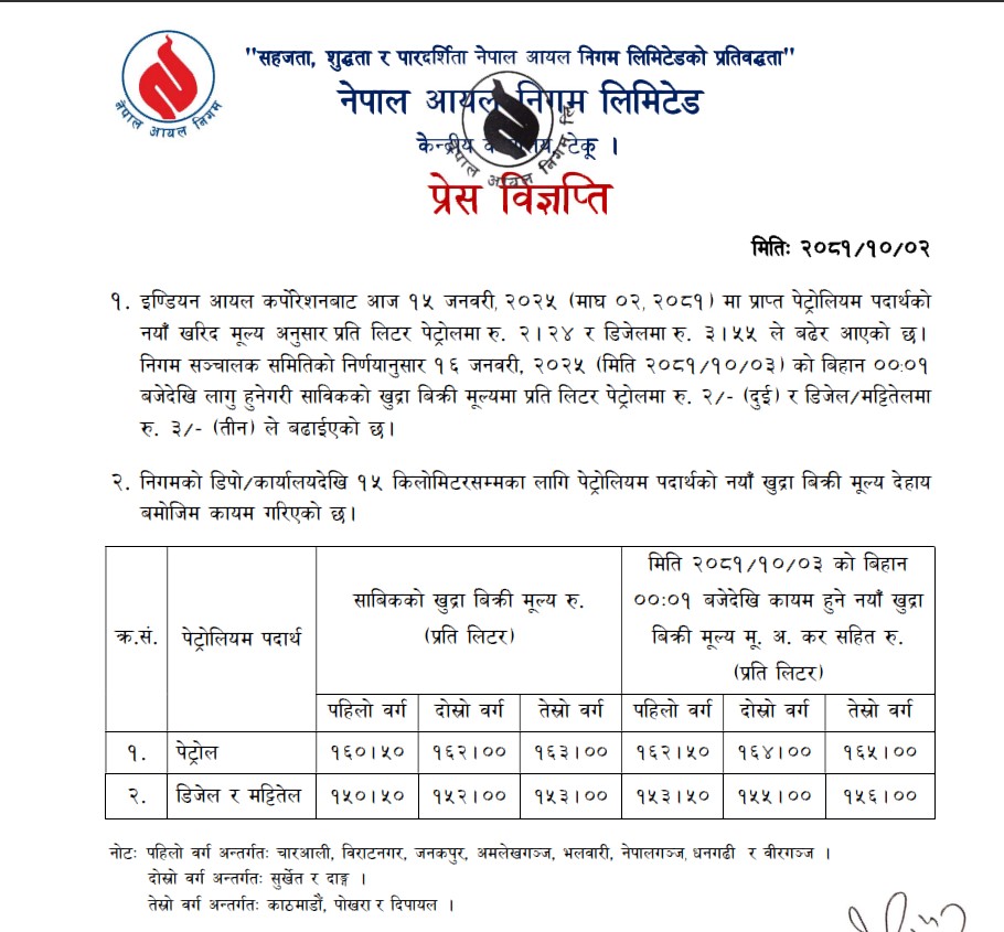 नयाँ मूल्य अनुसार अब पेट्रोल प्रतिलिटर १६५ रुपैयाँ, डिजेल र मट्टितेल १५६ रुपैयाँ कायम भएको छ । निगमका अनुसार भारतबाट मूल्य बढेर आएपछि नेपालमा पनि मूल्य बढाइएको हो । इण्डियन आयल कर्पोरेशनबाट पेट्रोलमा प्रतिलिटर २.२४ र डिजेलमा ३.५५ रुपैयाँले मूल्य बढेर आएको जनाइएको छ ।