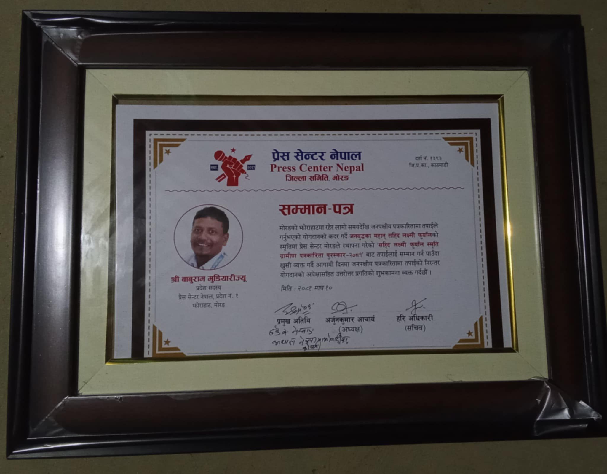 महेश भट्टराई / काठमाण्डू : प्रेस सेन्टर नेपालको पाँचौ मोरङ जिल्ला सम्मेलनका अवसरमा शहीद लक्ष्मी फुयाल स्मृति ग्रामीण पत्रकारिता पुरस्कारबाट पत्रकार बाबुराम मुडियारी पुरस्कृत भएका छन् ।
