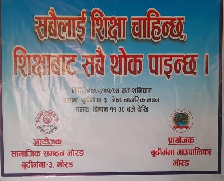 विराटनगर : माेरङकाे बुढीगङ्गा गाउँपालिका वडा नम्बर -३ स्थित जेष्ठ नागरिक भवनमा सामाजिक संगठन मोरङले “शिक्षा चाहिन्छ शिक्षाबाट सबैथोक पाइन्छ” भन्ने नाराका साथ हिजो एक कार्यक्रम सम्पन्न गरेको छ ।