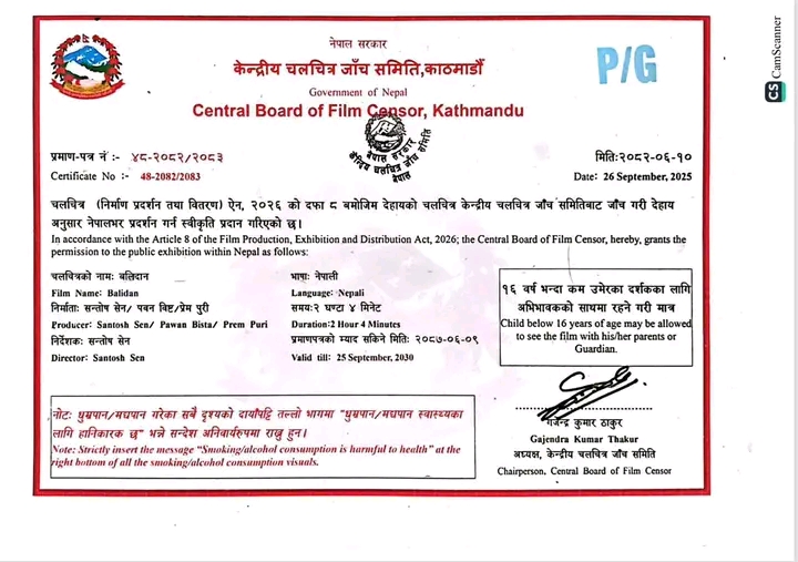 फूलपातीका दिनबाट प्रदर्शनमा आउन लागेको नेपाली चलचित्र *‘बलिदान’*लाई केन्द्रीय चलचित्र जाँच समितिले पेरेन्टल गाइडेन्स (PG) प्रमाणपत्र प्रदान गरेको छ। यसअनुसार सबै उमेरका दर्शकले अभिभावकको साथमा फिल्म हेर्न पाउनेछन्।