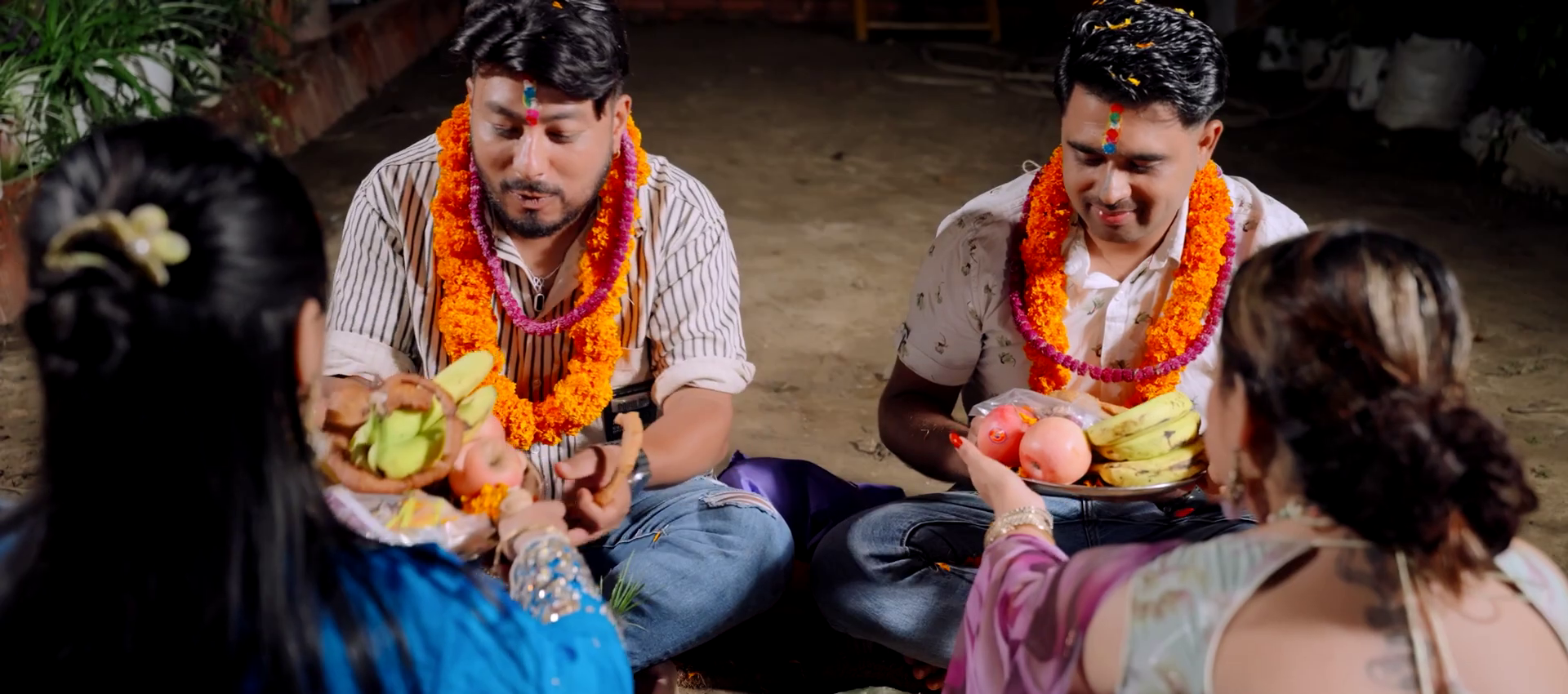 कलाकार रुपेशका अनुसार प्रबासमा रहेका एक पल्टने दाजु तिहार मान्न स्वदेश आएका र दिदी बहिनी दाजु भाइको आत्मियताका साथमा तिहार पर्व निकै हर्षउल्लासले मनाइएको कथा समाबेस गरिएको छ । साथै गीतमा एक प्रेमी र प्रेमिकाको पानि कथा समाबेस गरिएको छ ।