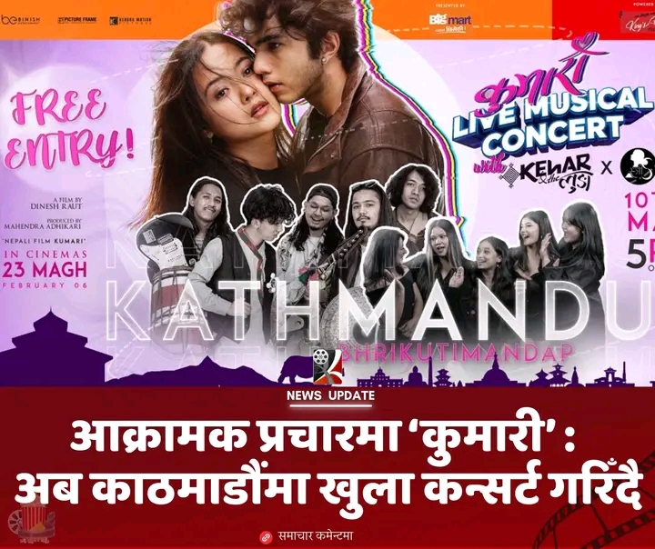 माघ २३ गतेदेखि प्रदर्शनमा आउन लागेको लभस्टोरी फिल्म ‘कुमारी’ ले प्रचार–प्रसारलाई थप आक्रामक बनाएको छ । देशव्यापी सांगीतिक यात्रामा निस्किएको फिल्मको टिमले यही शनिबार संघीय राजधानी काठमाडौंमा खुला कन्सर्ट आयोजना गर्ने भएको छ । भृकुटीमण्डपस्थित प्रदर्शनी स्थलमा आयोजना हुने उक्त कन्सर्ट साँझ ५ बजेदेखि सुरु हुनेछ । दर्शकका लागि कन्सर्ट निःशुल्क राखिएको छ । आयोजकका अनुसार कार्यक्रममा १० हजारभन्दा बढी दर्शक सहभागी हुने अपेक्षा गरिएको छ ।